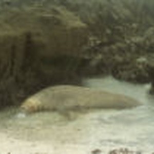 A six year old male seal is lying in shallow water and blowing bubbles on Shell Island.