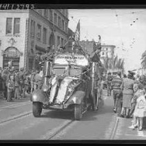A decorated truck with men in the back. The truck has a banner which reads "South Side Legion Post No. 622".