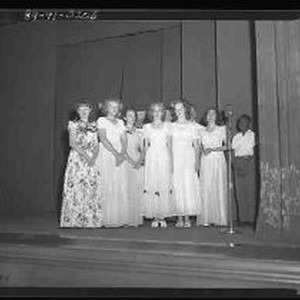 A group of high school girls wearing formals and two boys posed on a stage with a microphone. Original container marked "Grant Union" (High School, Del Paso Heights, North Sacramento)