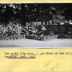 Typed on binder page "The south lily plot,,,, in frontof the building. December , 21st, 1951". View of a flower bed in Capitol Park.
