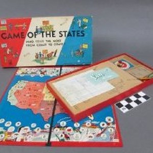 "Game of the States" maker - Milton Bradley 4920 A. Contains game board, play tokens, cards, and spin card. Box is red, white and blue cardboardwith black lettering and multi-colroed graphics of people.