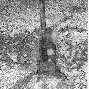 Shows a wood post with a concrete footing.