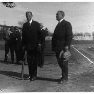 Several men in suits & ties, gathered on baseball diamond.