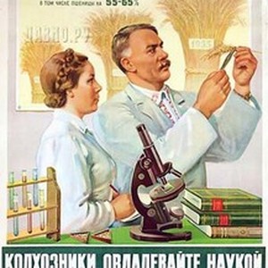 Soviet poster. Captions read, "Колхозники, овладевайте наукой, будьте мастерами высоких урожаев! / Kolkhozniki, ovladevaite naukoi, bud'te masterami vysokikh urozhaev!', meaning, "Collective farmers, use science, be the master-hands of high yields!". [Description English/roman)]