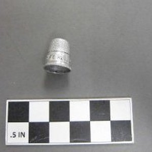 Metal thimble with embossed letters that read "People's Savings Bank"