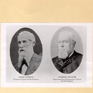 Two oval photo portraits of "Mark Hopkins, Treasurer Central Pacific Railroad" and "Charles Crocker, Superintendent Construction Central Pacific Railroad." [From student paper 1998/39/14: "Some Aspects of Theodore D. Judah's Activities in the Formation of the C.P.R.R."]