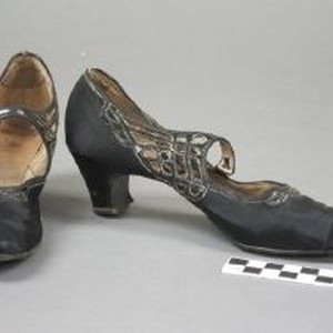 (1) pair woman's black satin with cut-out sides, strap and vamp, rounded toe and Louis heel.