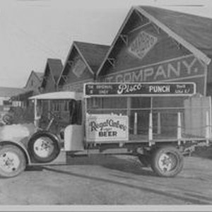 Photo--black and white: A vintage Regal Amber Lager Beer delivery truck parked next to Garbro Brand building. The beer truck also has a sign advertising "The original & only Pisco Punch You'll Like it." Circa 1920s. In the distant background left is the Sebastopol Feed Co. sign and building. The delivery truck is a Fageol which has distinctive louvers on top of hood. The location of the probably is thought to be ( per Harold Pellini) on Petaluma Avenue south of Frizelle Enos. See 6570, 6425, 7447 photos for possible same buildings.