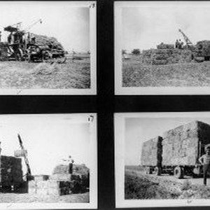 "Upper left, baling hay. Upper right, loading five-wire bales, weighed about 150 pounds."