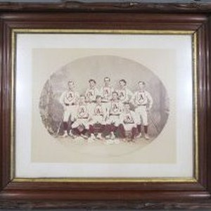 Print, Photographic, Black & White. Hand-colored. Depicts the amateur Amity baseball team of Sacramento in original wood frame.