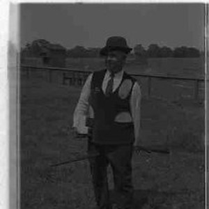 SERIES - Three views of an unidentified man standing in a field astride a shotgun.