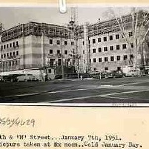 Typed on binder page "8th & 'M'...January 7th, 1951. Picture taken at noon..Cold January Day". View of a new, partially completed State building under construction.