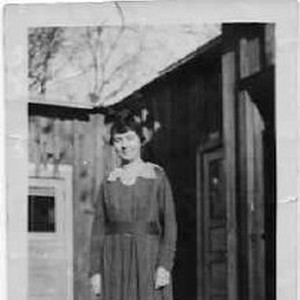 Exterior view of Miss Helen Kathryn Dooley, teacher posing on a porch. Possibly the school property. Inscription on verso reads: "Miss Dooley, these are all of the 1920 grades that we had Miss Dooley teacher of."