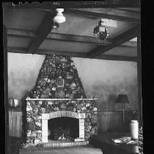 Interior view of a stone fireplace inside a lodge (?) - possibly the Volcano Lodge.