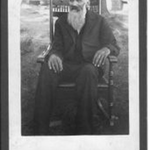 Photo--black and white: Portrait photo of Hezikiah Hawn, Bunni Myers (1906-2001) maternal grandfather taken in Ravenna, Ohio. Hawn is seated in rocking chair in a yard.