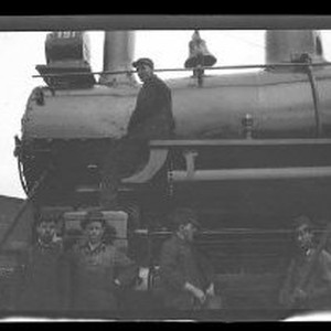 SERIES: Fifty three views of Chicago area scenes including Lake Michigan, State Street, the Chicago River, sternwheelers, and other landmarks. This is a view of a railroad engine with several men on or nearby.