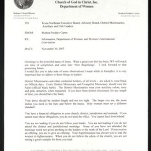 Freddye Carter (Church of God in Christ), Waco, Texas, memo, 2007 November 30, to "Texas Northeast executive board, advisory board, district missionaries, auxiliary and unit leaders" (Church of God in Christ). [Description English/roman)]