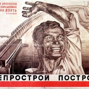 A poster dedicated to the completion of construction of DneproGES, a hydroelectric power plant on the Dnepr River in 1932. Caption at the bottom reads, "Dneprostroi postroen / Днепрострой построен", meaning, "The Dneprostroi construction has been completed". [Description English/roman)]