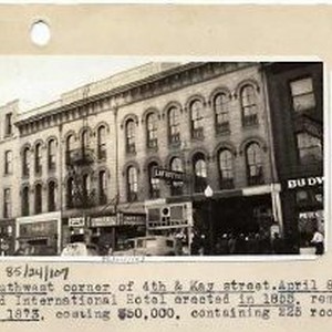 View of southwest corner of 4th & K Street. Featured is the International Hotel and Layayette Grill. People and autos in the foreground.