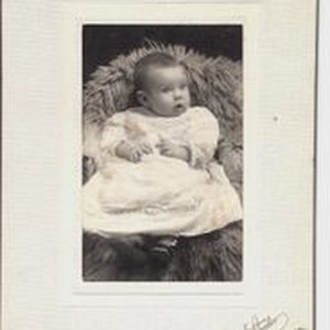 Photo--sepia, studio matted: Photo portrait of Ethel M. Sharp in 1907 at age five months. Ethel is the younger sister of Clifford, Gertie and Lester Sharp and child of Mr. & Mrs. Earl Sharp. Shaw Studio 647 Cherry Street, Santa Rosa, CA.