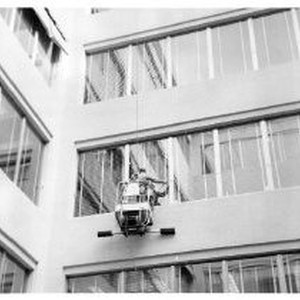 Exterior view of the new window washing machine in operation on windows that do not open in the new annex office building attached to the California State Capitol.