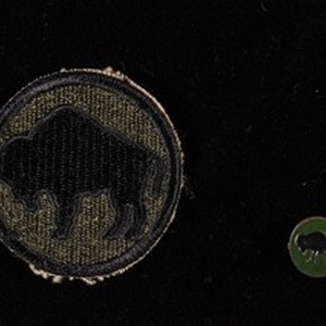 One patch and one pin belong to Hiroshi Sugiyama, indicating enrollment in the 92nd Infantry Division of the United States Army.
