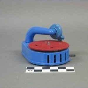 Blue plastic toy phonograph with metal turntable. Arm and needle can be removed for storage. Needle marked "MAR, USA."