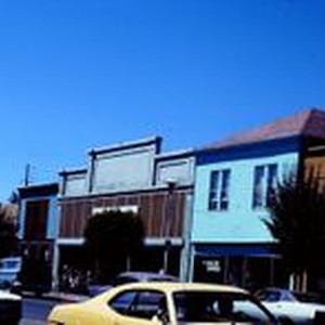 Slides, Kodachrome color transparency; North Main Street Sebastopol shops: Green Fingers, Analy Bazaar, Myst Books and Unique Boutique. February, 1976.
