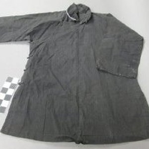 Blouse. Black cotton, hand-sewn, with frog closures at side in Chinese-style. Mandarin style collar with white piping along inside neck.