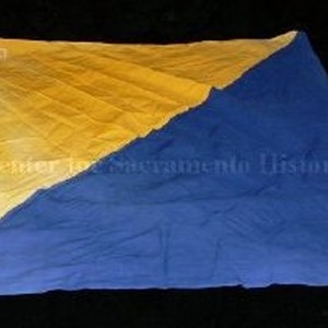 A Boy Scouts of America official neck scarf of blue and yellow cotton with BSA emblem printed in white in two corners; made of a yellow triangle and a blue triangle sewn together to make a square scarf.