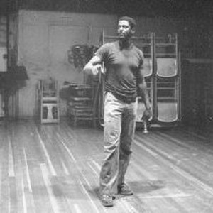 African American man carrying flashlight. In studio setting. Chairs and music stands stacked behind him.