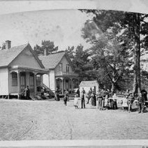 Exterior view of the "camp" at Pacific Grove. Twenty-six people appear in the scene including the Howe family and John Stevens. Two houses are seen on the left. A "street sign" reads: 13th Street on the facade of the house on the far left. See .158 for the names of the people at this gathering.