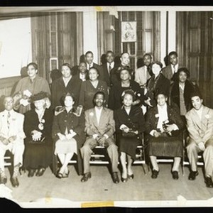Photograph of 19 unidentified people (10 women, 9 men), Church of God in Christ, Chicago, Illinois, [s.d.]. From Corby Bush? "Magic Karpet Studio, 6220 So. Cottage Grove Ave., MU 4-8852" -- stamped on back. [Description English/roman)]