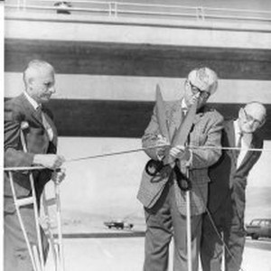 The photo caption printed in the Sacramento Bee on November 3, 1969 states: "State Sen. Randolph Collier of Yreka cuts a ribbon to open officially a 21.7 miles, $10.8 million section of Interstate 5 between Weed and Yreka. At left is H. S. Miles, Division of Highways district engineer from Redding who is on crutches because of a broken heel bone. At right is Earl F. Ager of Tulelake, chairman of the Siskiyou County Board of Supervisors. More than 100 persons, including numerous public officials, attended the dedication ceremony Saturday.