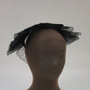 Women's stiff black net half hat with black veil and decorative black ribbon.