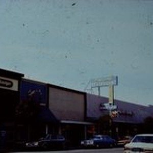 Print, color: West side of North Main Street Sebastopol circa 1970s. Businesses seen L-R: Unique Boutique, office equipment, the Pine Cone Restaurant, Mode O' Day, Carlson's Shoes and Analy Rexall Drugs.