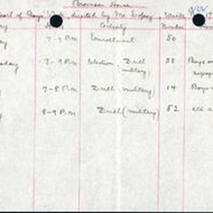 A chart written by hand for the Brownson House titled: "Report of Boys' Work, directed by Mr. Lopez, Week Nov. 17-21, 1919." The work were mostly military drills. The chart is drawn with pink ink on plain paper, writing in black ink.
