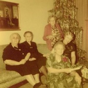 Mary seated on couch with Pasha and two other women beside her. Christmas decorations visible.