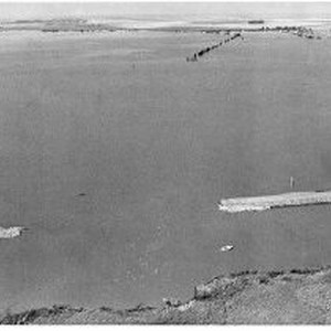 Aerial photograph of break in San Joaquin River levee, flooding Andrus Island.