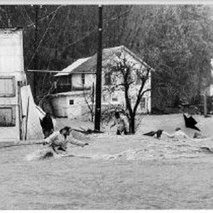 The photo caption printed in the Sacramento Bee on January 16, 1974 reads: "Rescuers yesterday afternoon saved 20-years-old Nancy Walke from the raging waters near her home in the vicinity of Dunsmuir's Butterfly Bridge, In the top photo (5968), the group prepares its equipment while the victim (arrow) clings to debris. Sgt. Bernard Schneider of the Dunsmuir Police Department moves toward the woman in the middle (subject) photo prior to her being pulled to safety"