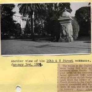 Typed on binder page "Another viw of the 10th & N Street entrance. January 3rd, 1952". Stone pillar at the walkway entrance to the state capitol.