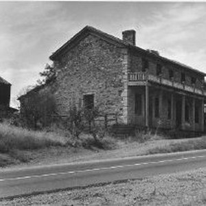 View from the highway of a gold rush era, two story, stone building in Forest Home.