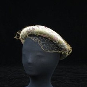 Women's gold brocade cap with rolled brim and very low rounded crown. Decorative veil and two rhinestone pins. Gold grosgrain ribbon sweatband. Labels: "Leslie James, California" and "The White House--Raphael Weill and Company, San Francisco"