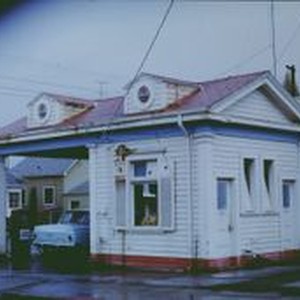 Slide--color: Gas station at corner of South Main and Willow Street at 300 South Main Street in Sebastopol, 1970. Current home (2012) of Grateful Bagel coffee house.