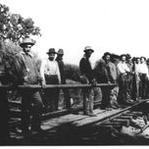 Photo, black and white: Crew of 19 workers on the P&SR railway laying tracks. Location unknown. Prior to 1904.