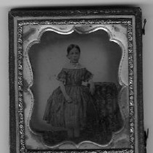 SERIES - A studio portrait of an unidentified girl about 8-10 years old. A necklace around her neck and earrings are gilt tinted. the hinges of the case have broken, so the case is in two parts 1999/117/416-420.