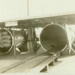 View of the almond sterilizing apparatus on the roof of this warehouse. It is capable of sterilizing an enormous amount of almonds by a special mixture of gases described elsewhere in notes. The tank on the right shows the metal door open. These tanks have a capacity for about 3 truck loads of almonds. An empty truck is shown at the far end of the tank. The tank on the left has been filled with bags of almonds ready for sterilization.