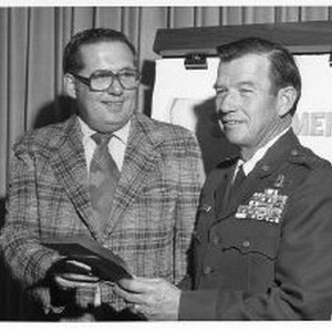 Unidentified military officer receiving plaque from identified man in business suit. Clip board in background reads Sacramento Air Logistics Center.