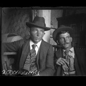 SERIES: This is a glass plate negative of two seated men wearing 3 piece suits, ties, and hats.