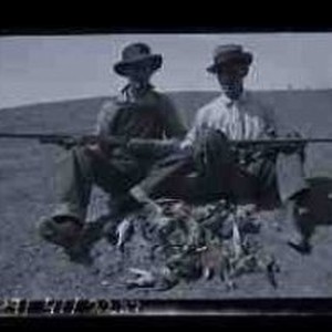 Two young men sitting in an unidentified field holding shotguns with a pile of dead doves at their feet. Original envlope marked "Dove Hunters Dunnigan 8-3-1913 with doves Ed, H - Baker - Dot - Tom"